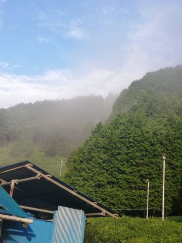 作業場の裏は、茶畑が山頂近くまで広がっており、この霧がおいしいお茶を育てるのです。